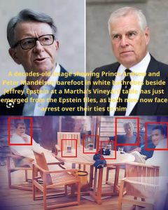 A decades-old photograph has surfaced from the Jeffrey Epstein files, showing former Prince Andrew (now Andrew Mountbatten-Windsor) and veteran British politician Peter Mandelson relaxing barefoot in white bathrobes alongside the late convicted sex offender at a wooden table on Martha’s Vineyard. The image, believed to date from 1999 or 2000, has reignited intense scrutiny over the men’s ties to Epstein and comes as both now face serious legal consequences in the UK.