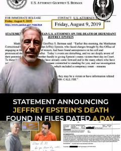 The document, part of the massive Justice Department disclosure under the Epstein Files Transparency Act, carries a date of Friday, August 9, 2019. Its wording closely mirrors the official statement eventually issued: it informs the public that Epstein “had been found unresponsive in his cell” at the Metropolitan Correctional Center and had been pronounced dead shortly afterward. The draft is attributed to the office of then-U.S. Attorney Geoffrey Berman for the Southern District of New York.